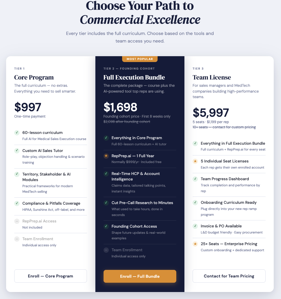 Full Execution Bundle enrollee receives one full year of access to RepPrep.ai (normally $999/year), an AI-powered platform that transforms market, account, and HCP data into instant, actionable insights.