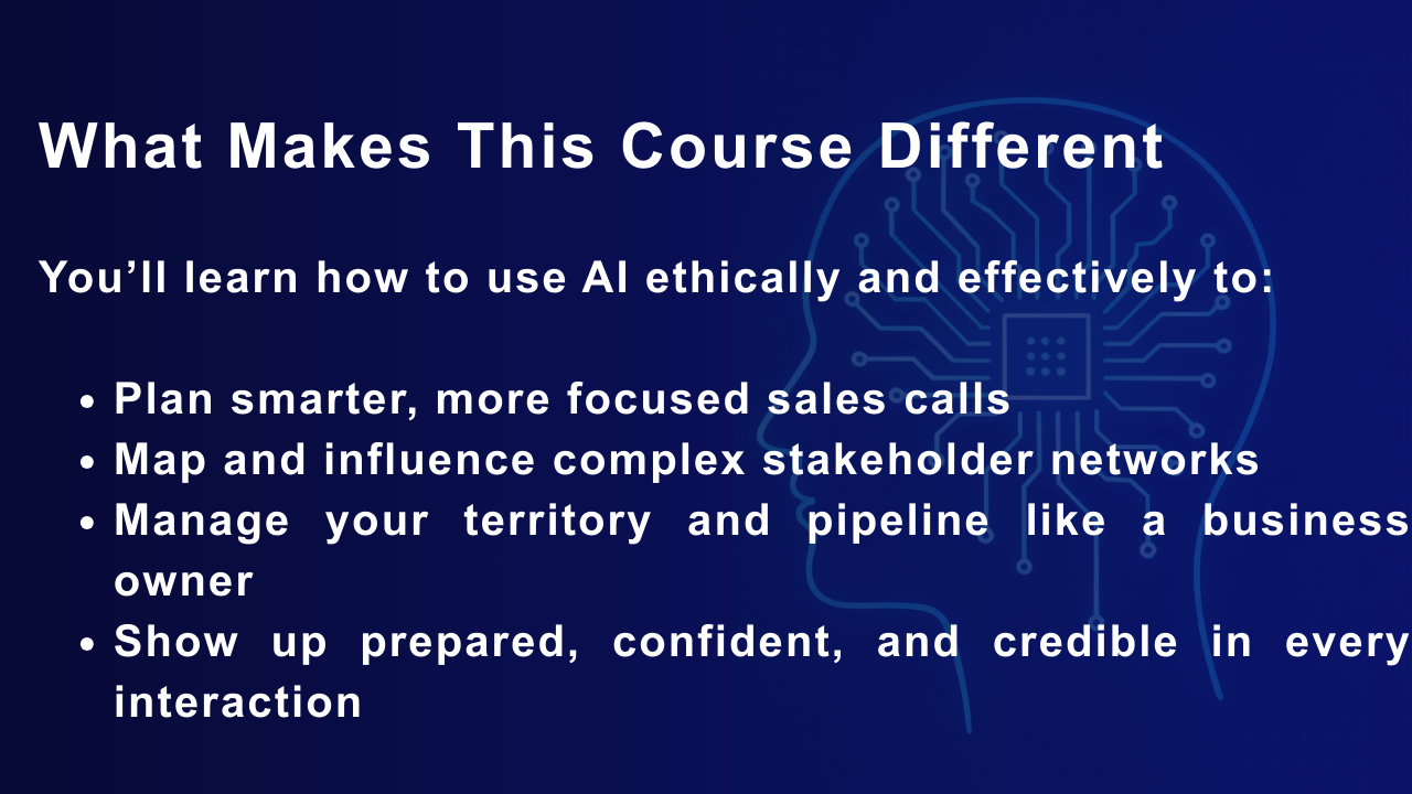 The goal is not just to learn AI concepts, but to integrate AI into your daily workflow alongside proven medical sales frameworks that have defined successful territory and stakeholder strategy long before AI existed.